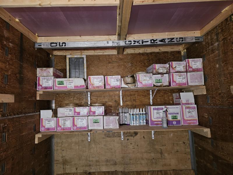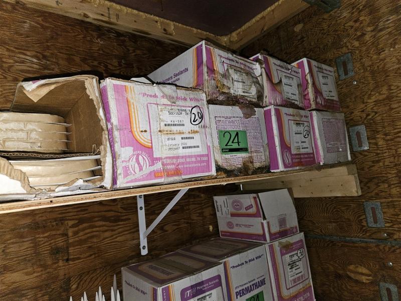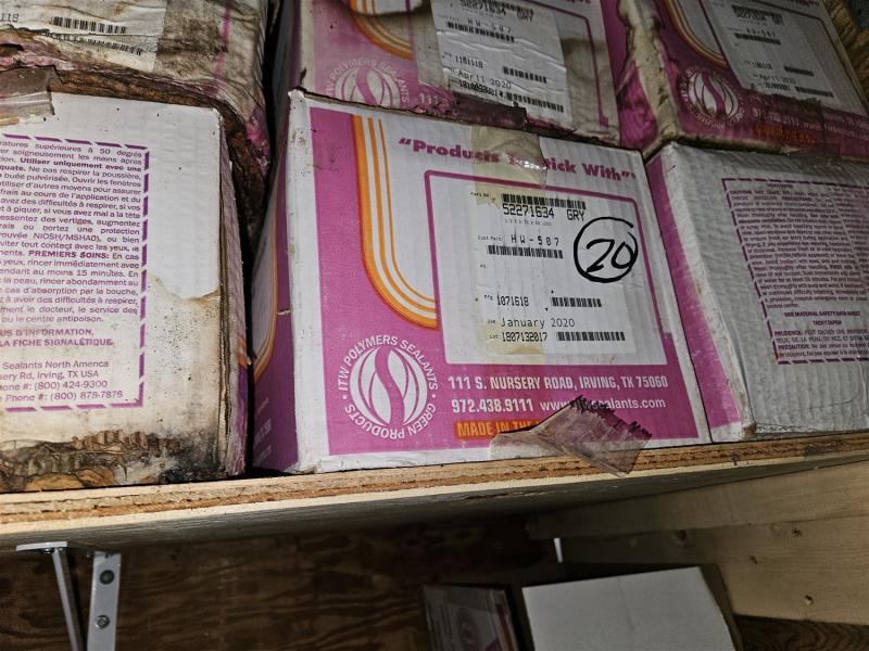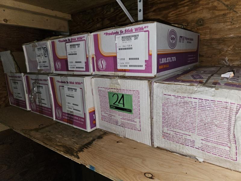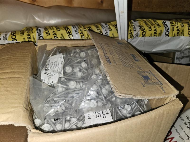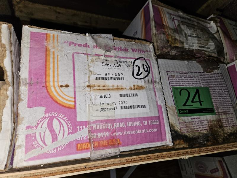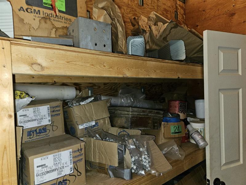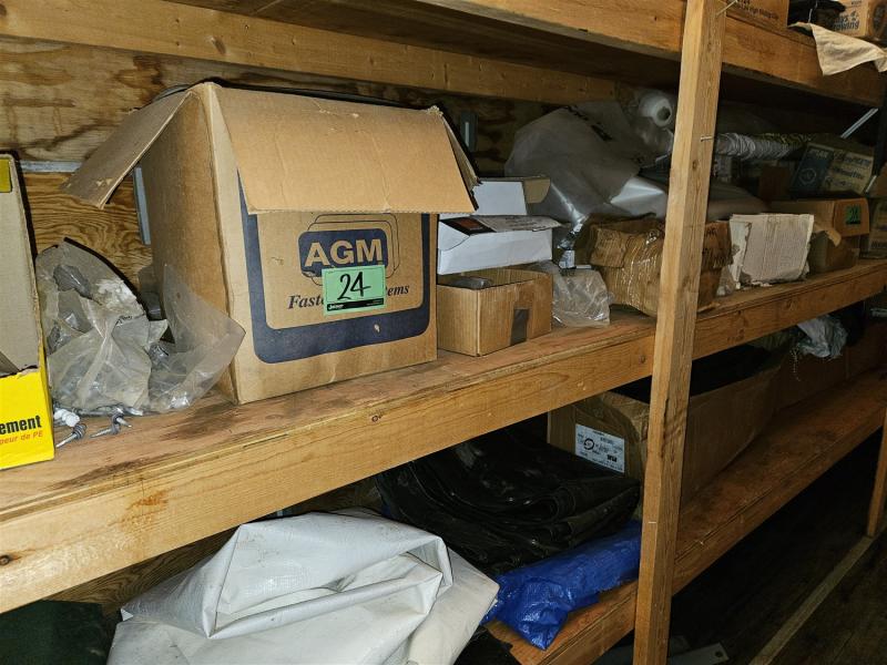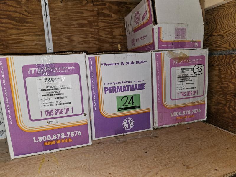 CONTENTS OF LOT # 22 TRAILER – ASSORTED FASTENERS, POLY, SLIDING CLIPS, STEEL PLATES, APPROX. 24 BOXES OF ITW SEALANTS, CAULKING