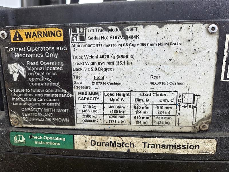 2012 HYSTER FORTIS 50, CAP. 4800 LB - -METER READS 15600 HRS, CUSHION RUBBER,189" LIFT, SS, (OFFSITE IN ABBOTSFORD, BC)