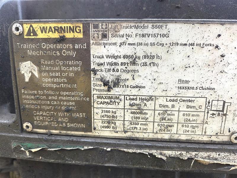 2016 HYSTER S50FT, CAP. 4900LB, METER READS 20637 HRS, 189" LIFT, SS, CUSHION RUBBER, S/N F187V15710G (OFFSITE IN ABBOTSFORD, BC)