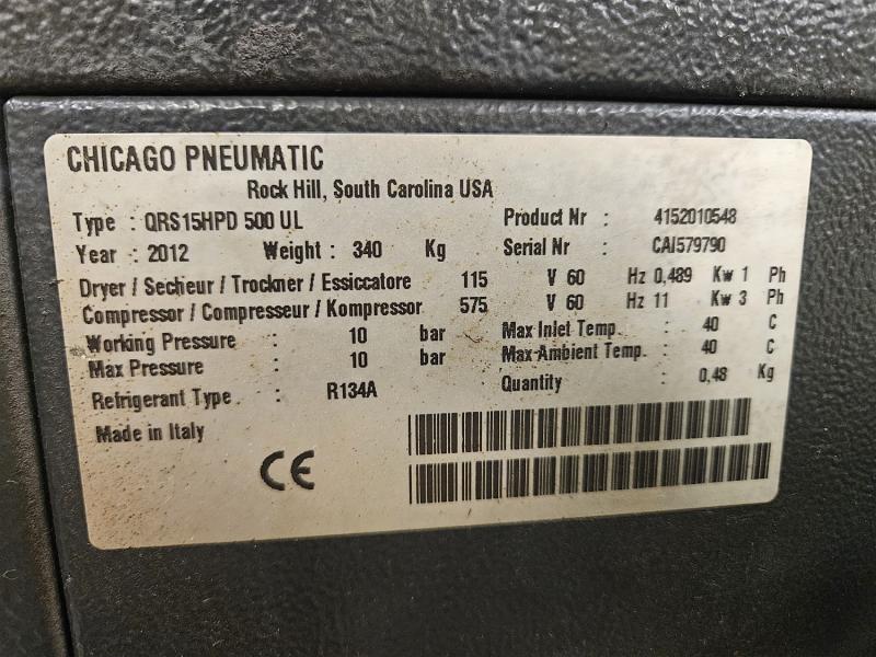 2012 CP QRS 15 SCREW COMPRESSOR/DRYER TYPE QRS15HPD 500 UL, METER READS 92224 HRS, 575V/3 COMPRESSOR, 115V/1 DRYER
