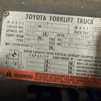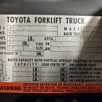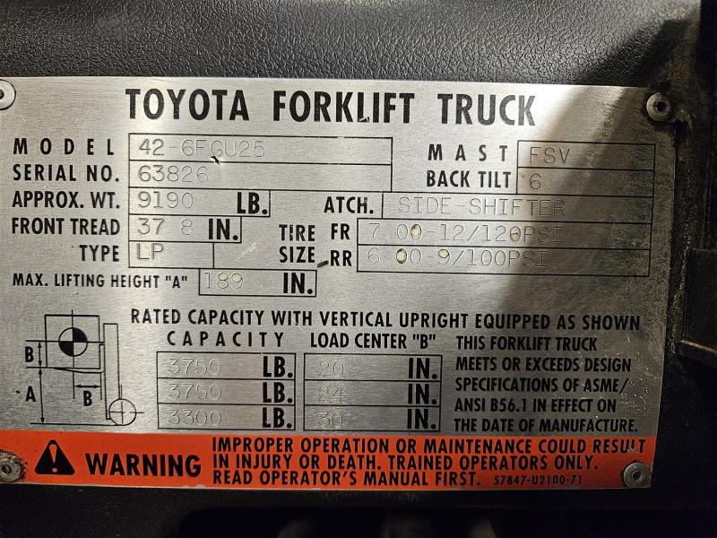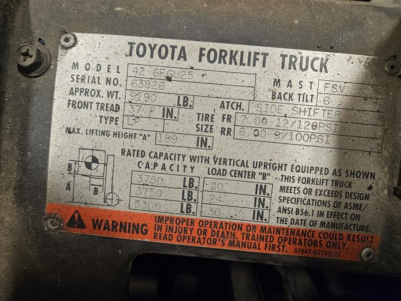 TOYOTA 42-6FFGU25 3750# CAP., 189" LIFT, SS, S/N 63826, PROPANE, METER READS 13571 HRS.